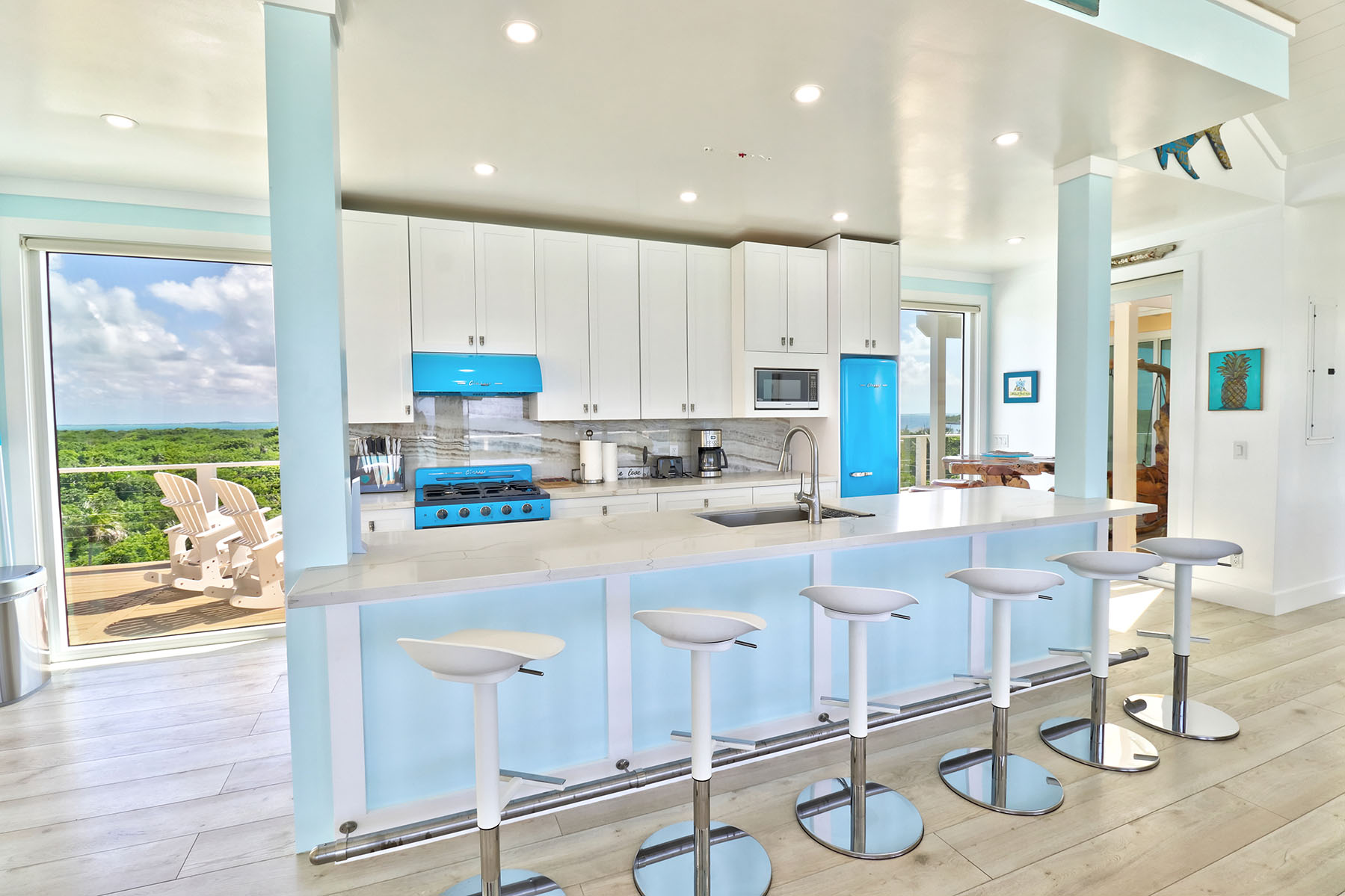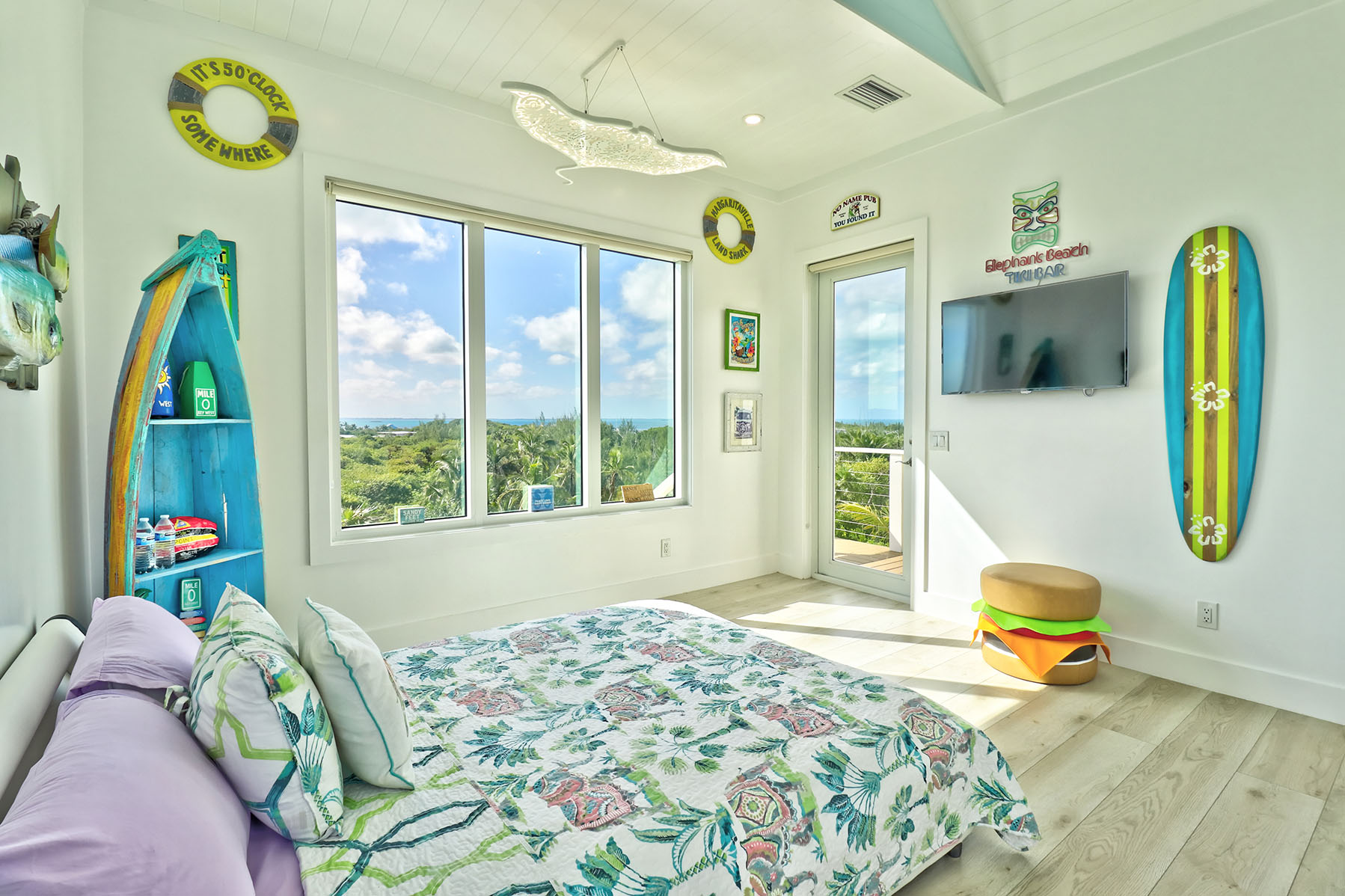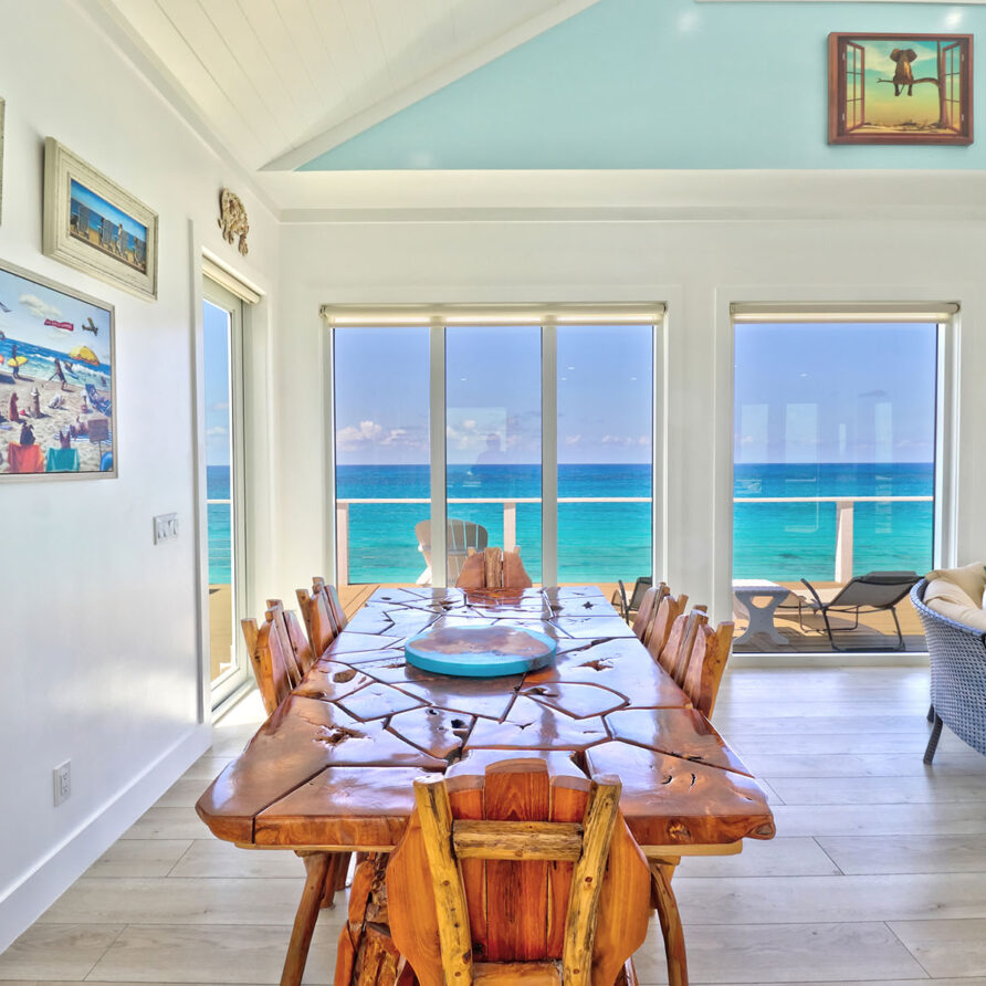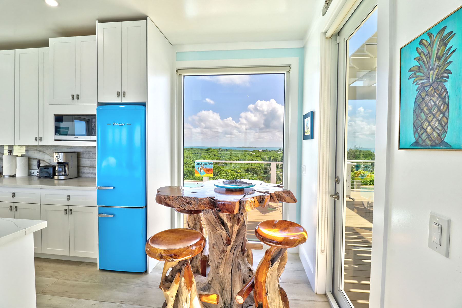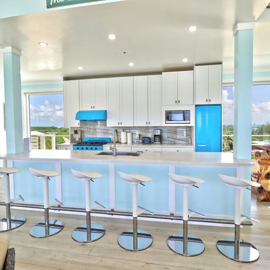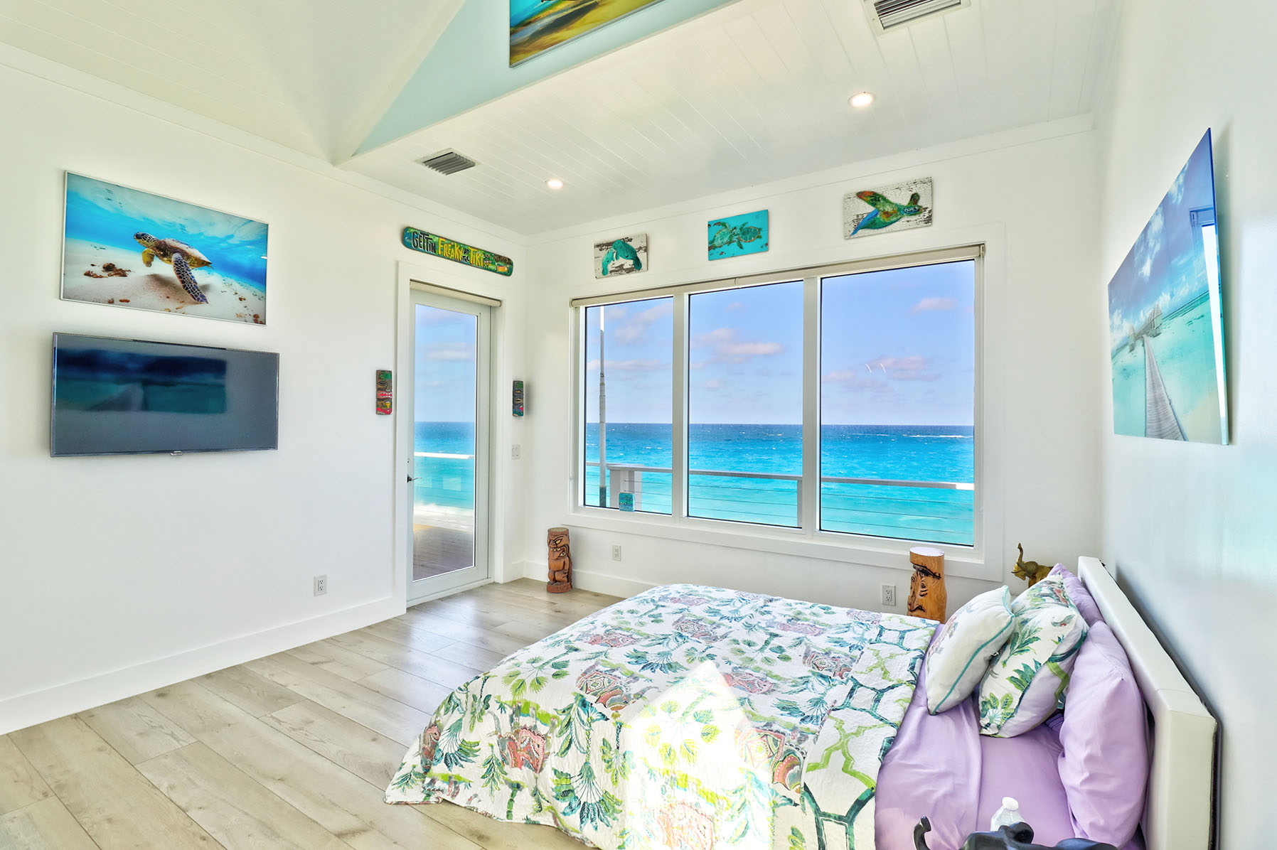 We are proud to introduce Elephant Beach House 2.0. The new place has 3 bedrooms & 3 bathrooms in 2,100 square feet. It rests upon stout 12 foot pilings, which has served to make the views even more spectacular than before. The house is mostly windows & has multiple, strategically placed doors that you can open to allow the beach breeze to blow through. The huge decks double the living space and contain 2 thatched tiki bars (one on each side of the house). There is a 16′ x 8′ swim/spa that overlooks the island and the Sea of Abaco. A unique teak swing is a perfect spot to take in the wonderful sunsets. There is a 12′ x 12′ deck down on the ground level that overlooks the beach and ocean and then continue on to the spacious stairs with comfortable landings provide additional living space to enjoy the spectacular views. Our beach is composed of some of the softest beach sand you will find anywhere in the world and is secluded (you may observe 10 people walk down the beach all day)! The house has central air and ceiling fans in generous vaulted ceilings. Every room contains huge picture windows with priceless views. The great room has a large flat screen TV with a semi-circular couch. The dining table is made of teak by artisans from Indonesia and seats 6. The spacious kitchen has a large island with 6 stylish bar stools. There is also a way-cool teak high top breakfast bar with 4 teak stools that overlooks the pool and island/Sea of Abaco view. The refrigerator & oven are a colorful retro-blue. The house is decorated throughout with beautiful tropical/island art. If you are like us, you will never want to leave. The house sits on a large lot that is 173 feet on the ocean and 750 deep with a tropical jungle surrounding the property. There is a backup diesel generator in case of power outages.