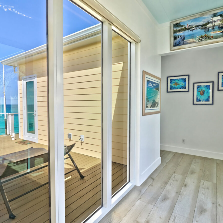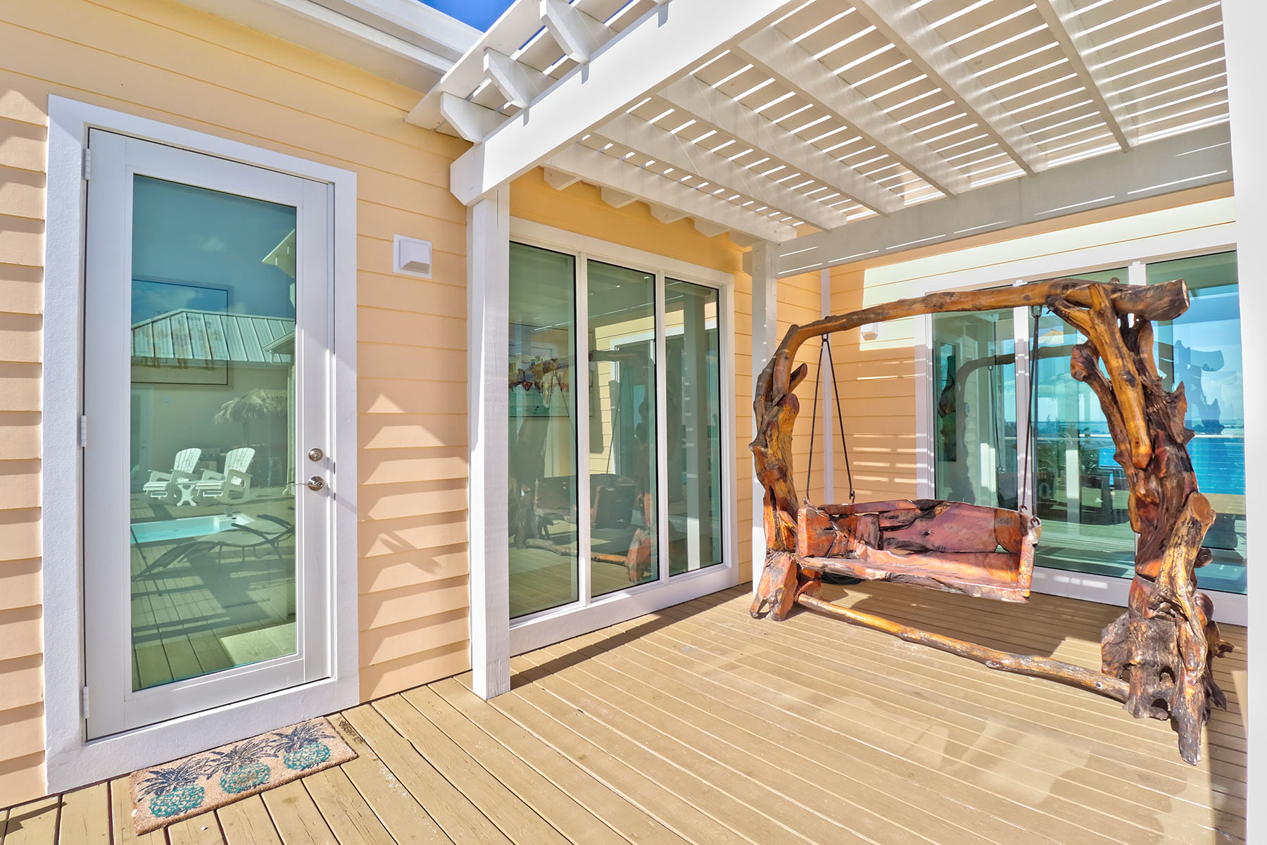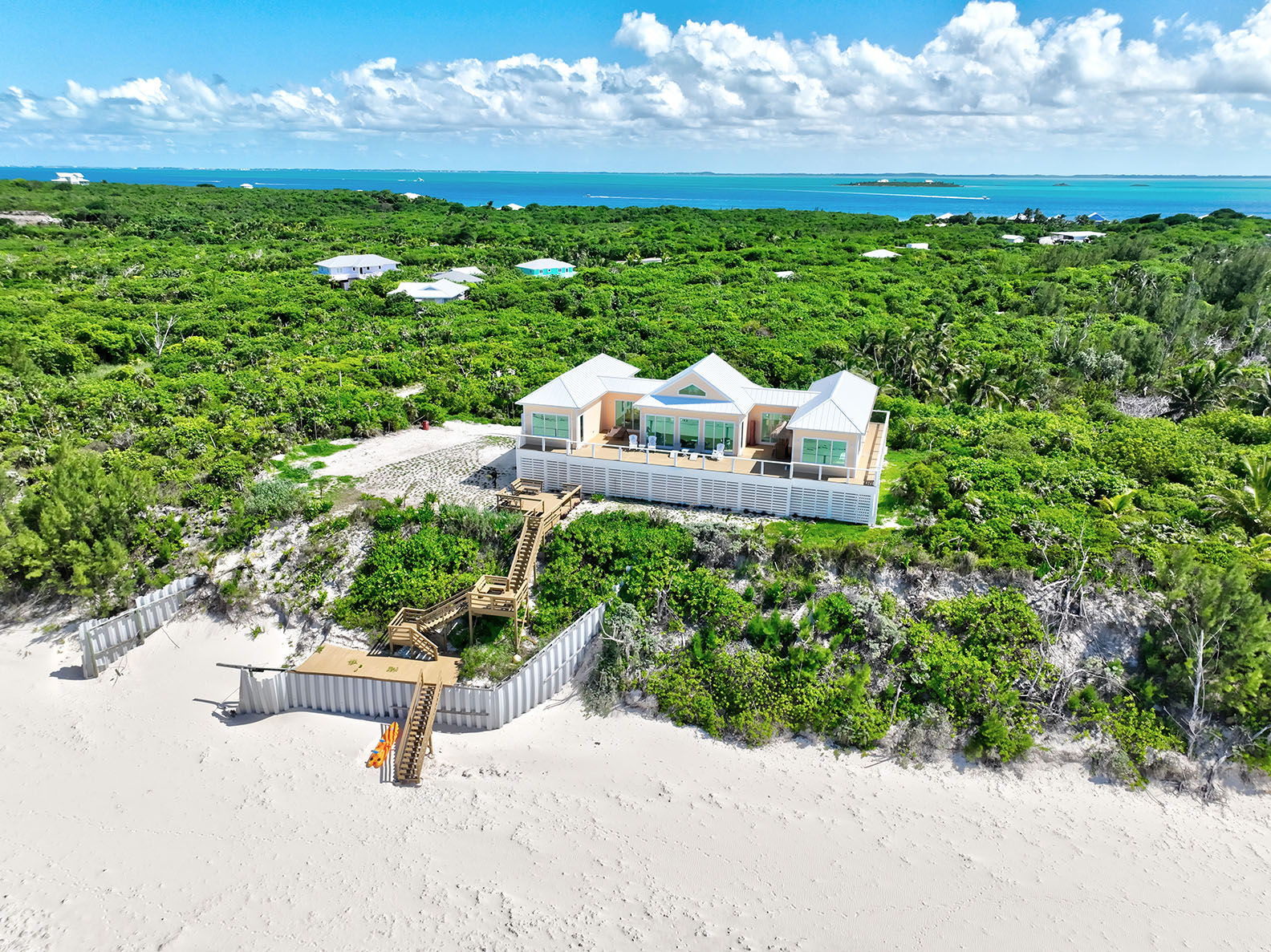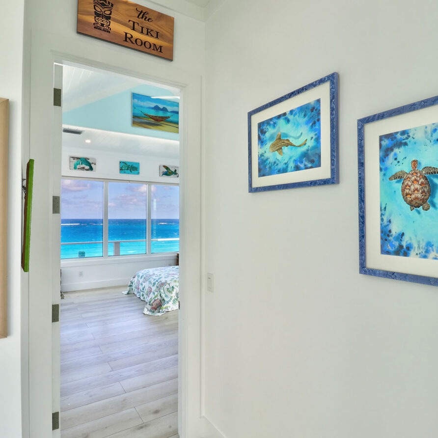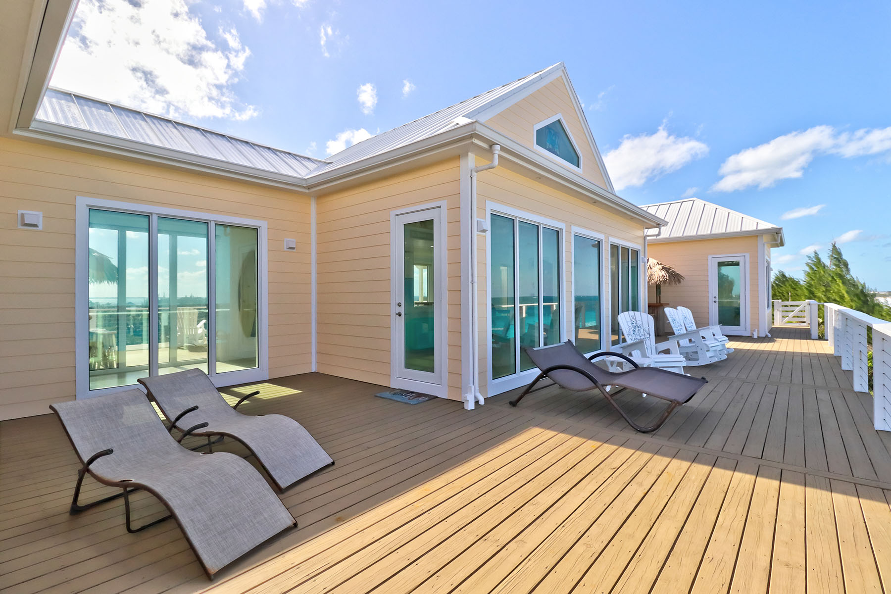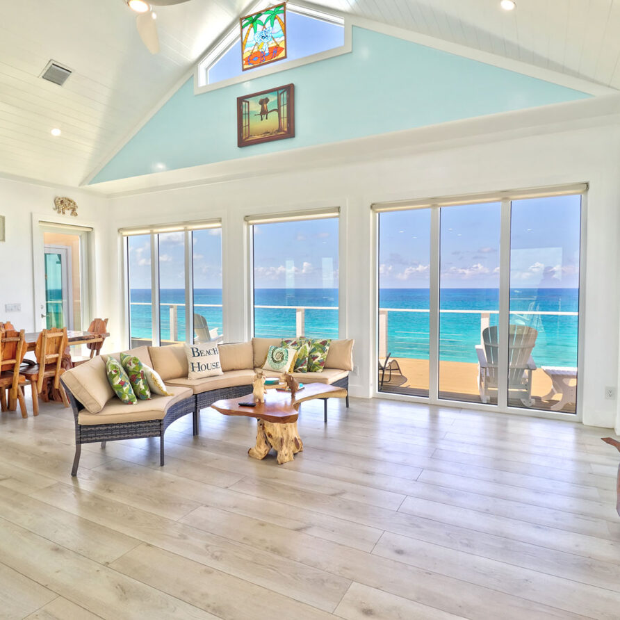 We are proud to introduce Elephant Beach House 2.0. The new place has 3 bedrooms & 3 bathrooms in 2,100 square feet. It rests upon stout 12 foot pilings, which has served to make the views even more spectacular than before. The house is mostly windows & has multiple, strategically placed doors that you can open to allow the beach breeze to blow through. The huge decks double the living space and contain 2 thatched tiki bars (one on each side of the house). There is a 16′ x 8′ swim/spa that overlooks the island and the Sea of Abaco. A unique teak swing is a perfect spot to take in the wonderful sunsets. There is a 12′ x 12′ deck down on the ground level that overlooks the beach and ocean and then continue on to the spacious stairs with comfortable landings provide additional living space to enjoy the spectacular views. Our beach is composed of some of the softest beach sand you will find anywhere in the world and is secluded (you may observe 10 people walk down the beach all day)! The house has central air and ceiling fans in generous vaulted ceilings. Every room contains huge picture windows with priceless views. The great room has a large flat screen TV with a semi-circular couch. The dining table is made of teak by artisans from Indonesia and seats 6. The spacious kitchen has a large island with 6 stylish bar stools. There is also a way-cool teak high top breakfast bar with 4 teak stools that overlooks the pool and island/Sea of Abaco view. The refrigerator & oven are a colorful retro-blue. The house is decorated throughout with beautiful tropical/island art. If you are like us, you will never want to leave. The house sits on a large lot that is 173 feet on the ocean and 750 deep with a tropical jungle surrounding the property. There is a backup diesel generator in case of power outages.