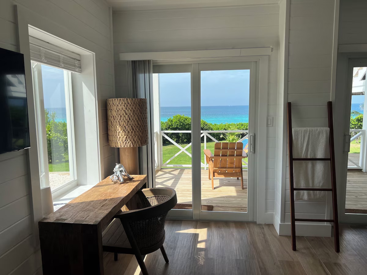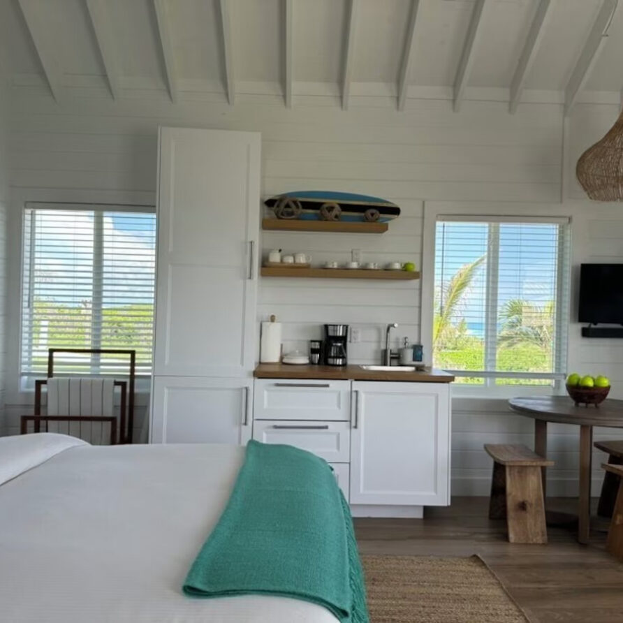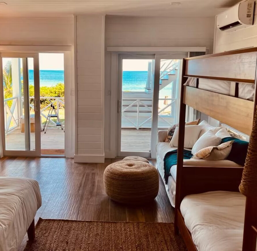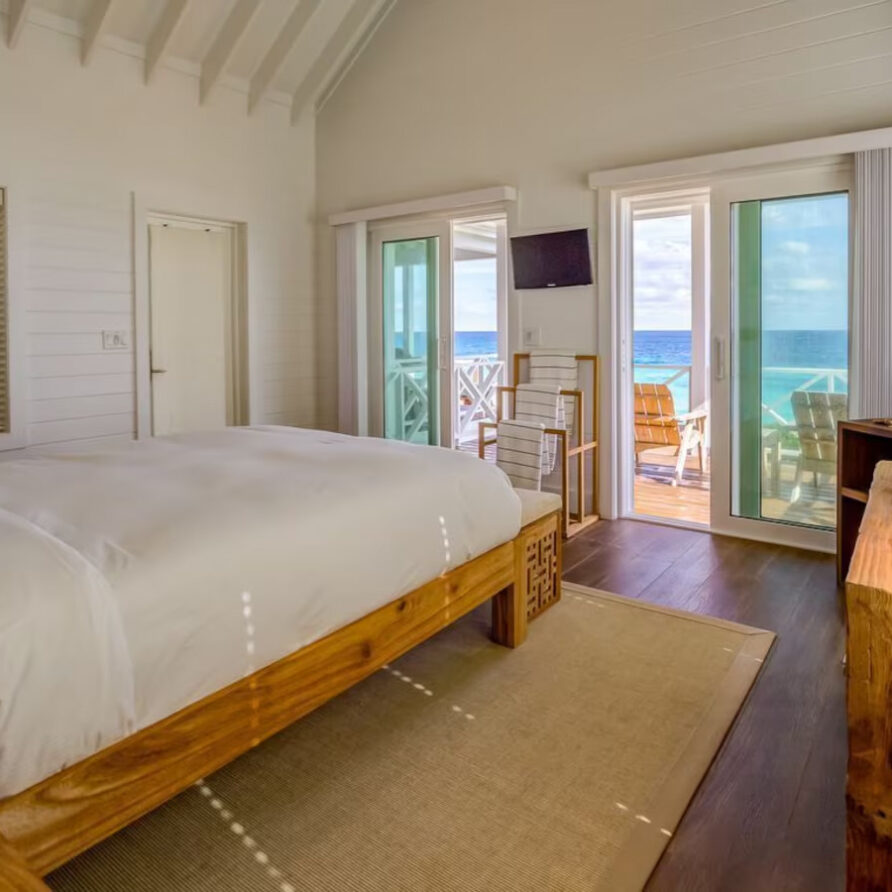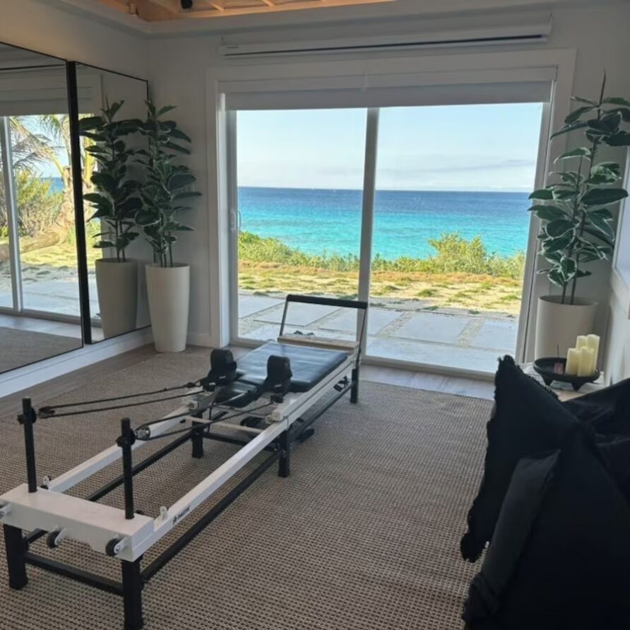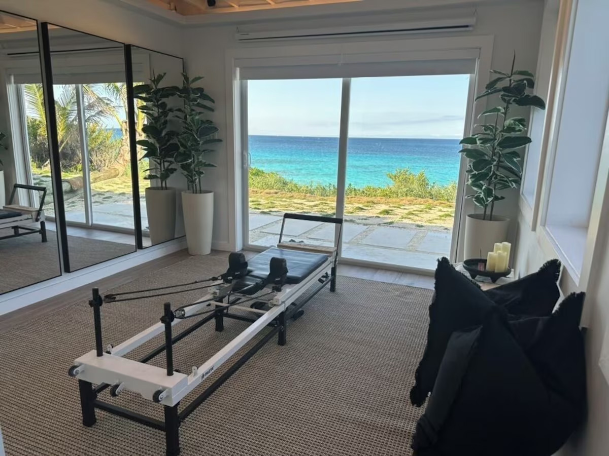In the main cottage you will find the spacious living area with a very well equipped gourmet kitchen and large dining area where you can entertain 8 people comfortably. There is a powder room in the main cottage as well. On the sides of the main cottage you’ll find 4 cottages comprising 5 en-suite bedrooms each with private entrances and ocean views. The level of privacy is perfect for up to 5 couples or 2 families with children. Four of the 5 bedrooms are equipped with a desk, TV, lots of closet space with a safe (2 with safe), a private porch overlooking the ocean and Starlink internet. The 5th bedroom is a versatile space with stunning oceanfront views that can be configured as a private fitness studio—featuring a Pilates reformer, dumbbells, bands, and yoga mats or configured as bedroom with a queen Murphy bed. Guests must select their preferred setup prior to arrival.