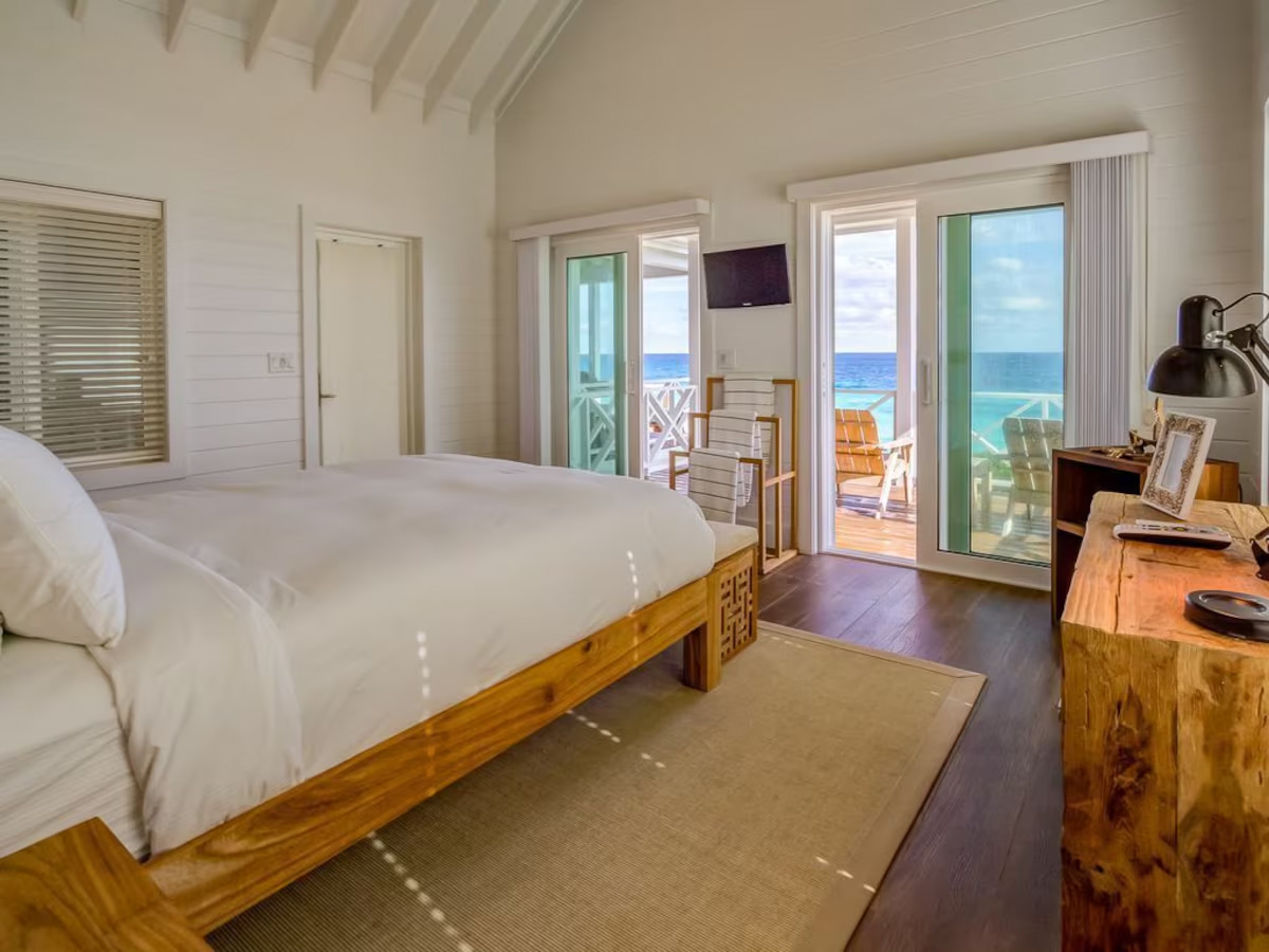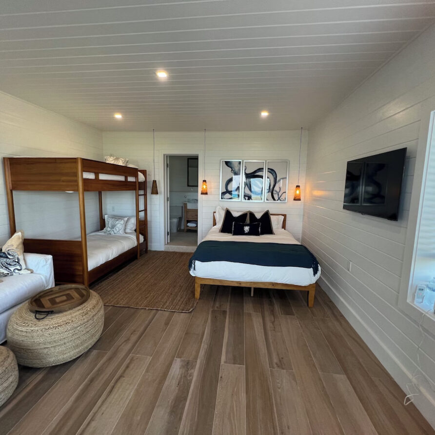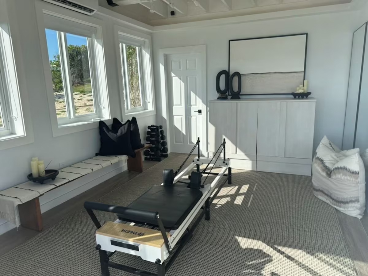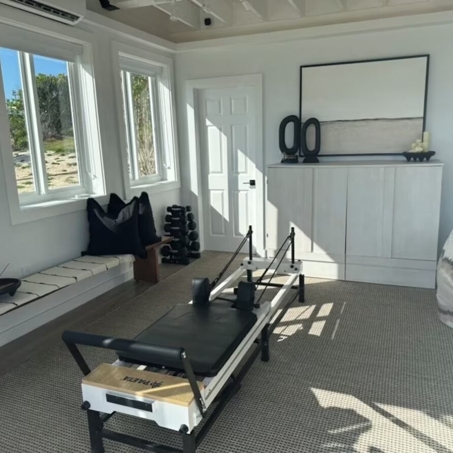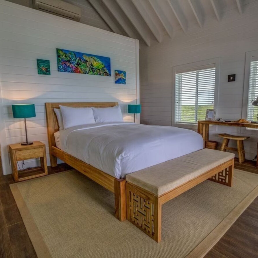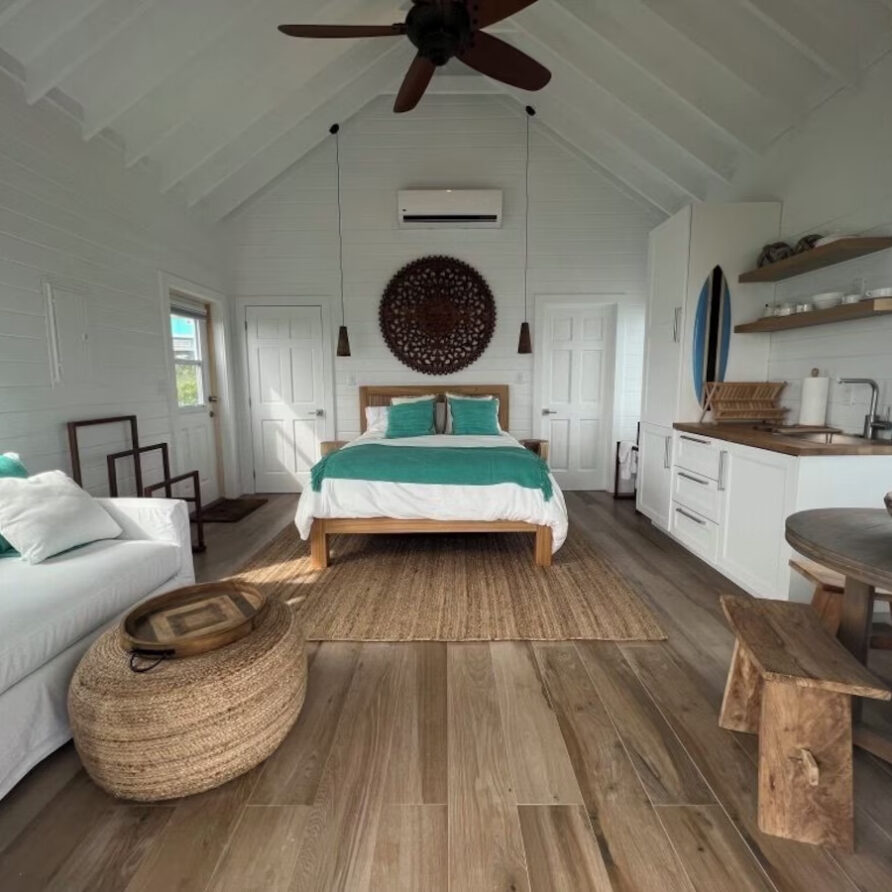In the main cottage you will find the spacious living area with a very well equipped gourmet kitchen and large dining area where you can entertain 8 people comfortably. There is a powder room in the main cottage as well. On the sides of the main cottage you’ll find 4 cottages comprising 5 en-suite bedrooms each with private entrances and ocean views. The level of privacy is perfect for up to 5 couples or 2 families with children. Four of the 5 bedrooms are equipped with a desk, TV, lots of closet space with a safe (2 with safe), a private porch overlooking the ocean and Starlink internet. The 5th bedroom is a versatile space with stunning oceanfront views that can be configured as a private fitness studio—featuring a Pilates reformer, dumbbells, bands, and yoga mats or configured as bedroom with a queen Murphy bed. Guests must select their preferred setup prior to arrival.