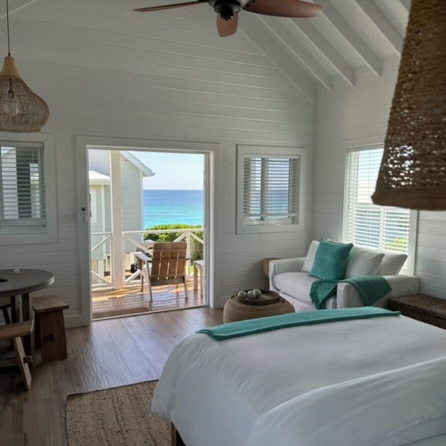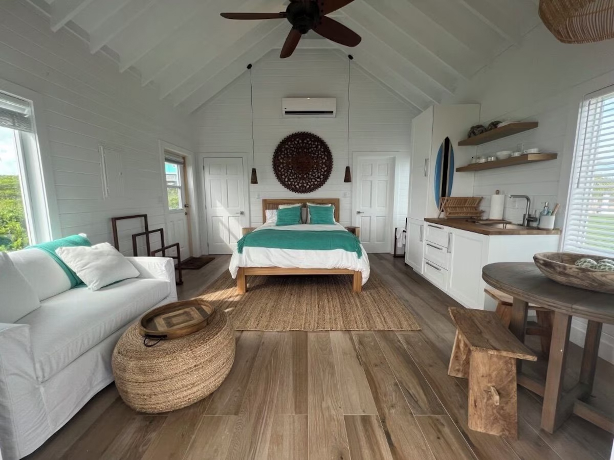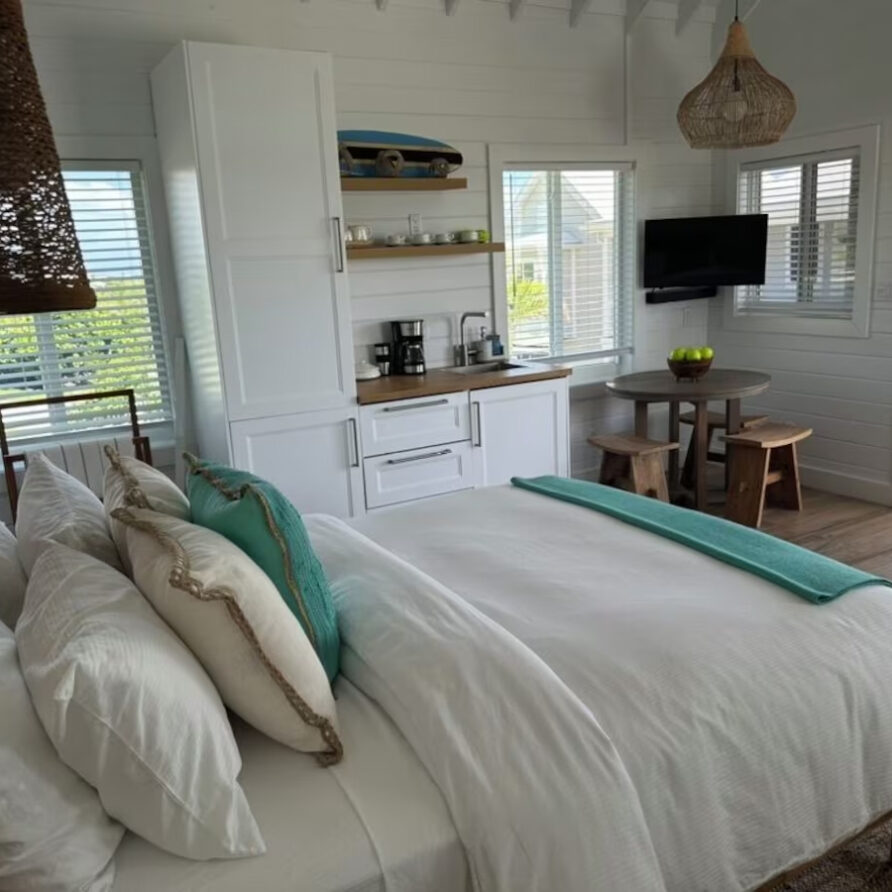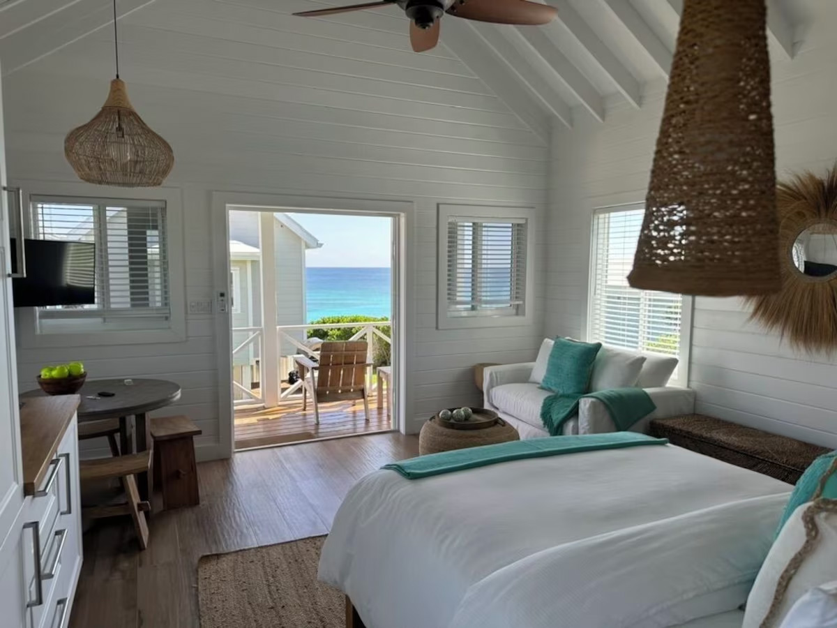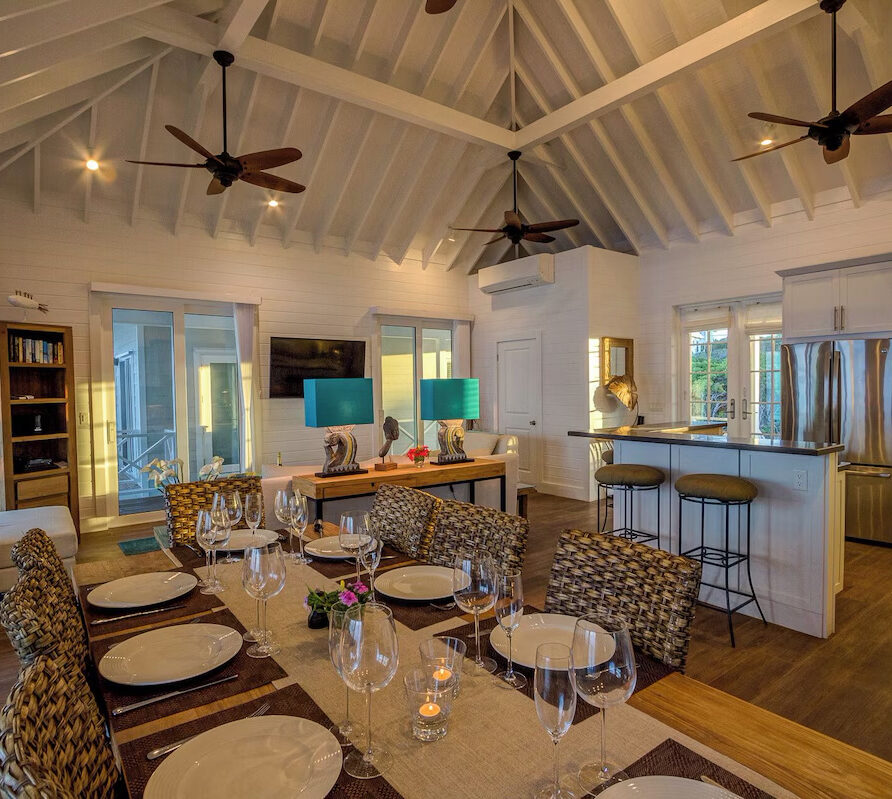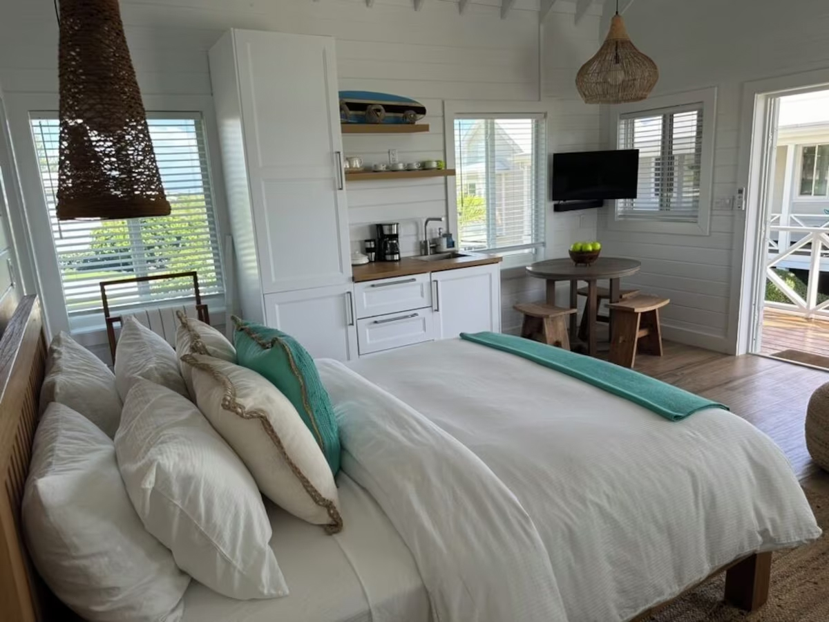 In the main cottage you will find the spacious living area with a very well equipped gourmet kitchen and large dining area where you can entertain 8 people comfortably. There is a powder room in the main cottage as well. On the sides of the main cottage you’ll find 4 cottages comprising 5 en-suite bedrooms each with private entrances and ocean views. The level of privacy is perfect for up to 5 couples or 2 families with children. Four of the 5 bedrooms are equipped with a desk, TV, lots of closet space with a safe (2 with safe), a private porch overlooking the ocean and Starlink internet. The 5th bedroom is a versatile space with stunning oceanfront views that can be configured as a private fitness studio—featuring a Pilates reformer, dumbbells, bands, and yoga mats or configured as bedroom with a queen Murphy bed. Guests must select their preferred setup prior to arrival.