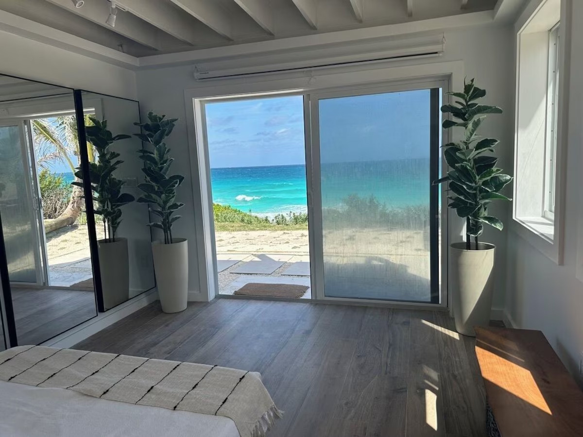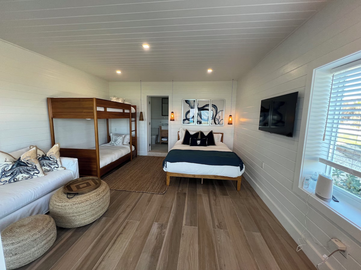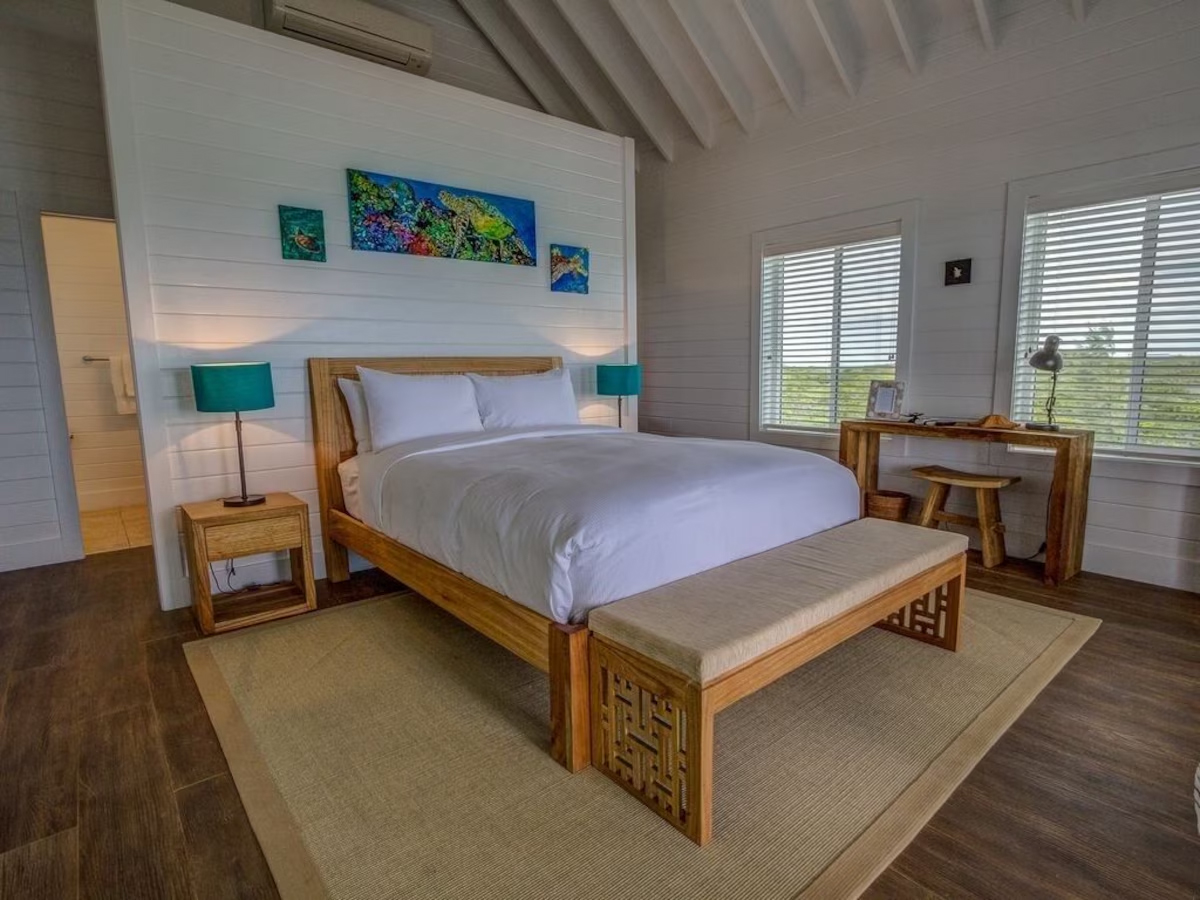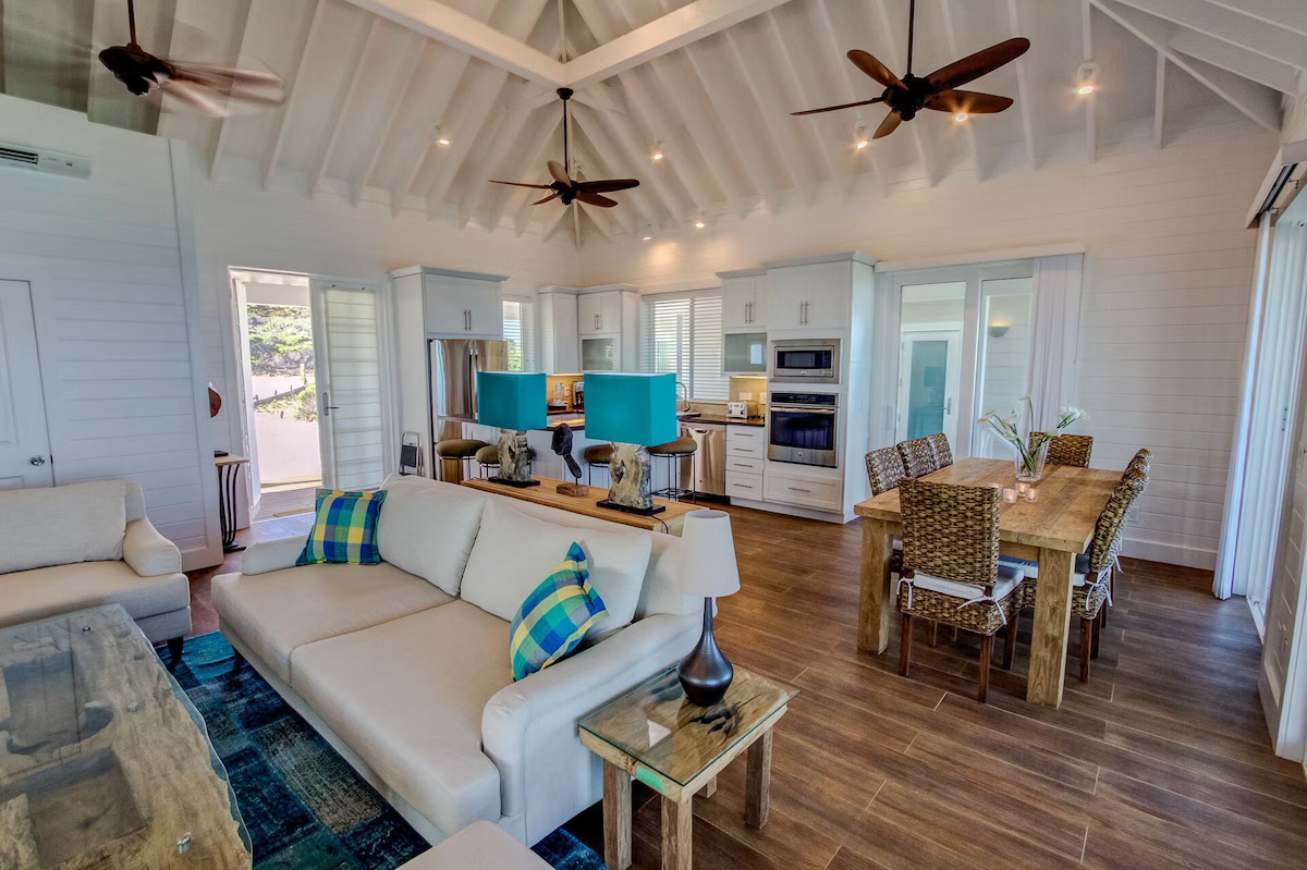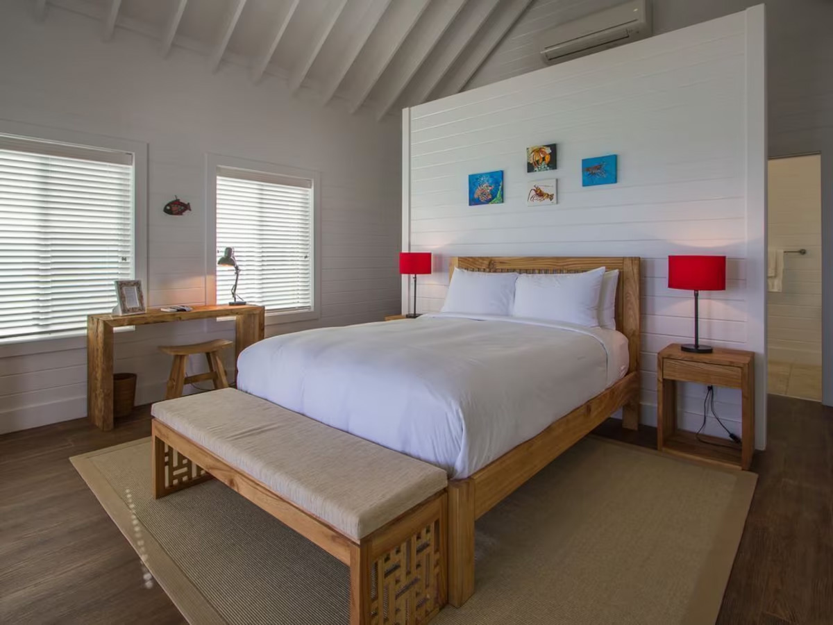 In the main cottage you will find the spacious living area with a very well equipped gourmet kitchen and large dining area where you can entertain 8 people comfortably. There is a powder room in the main cottage as well. On the sides of the main cottage you’ll find 4 cottages comprising 5 en-suite bedrooms each with private entrances and ocean views. The level of privacy is perfect for up to 5 couples or 2 families with children. Four of the 5 bedrooms are equipped with a desk, TV, lots of closet space with a safe (2 with safe), a private porch overlooking the ocean and Starlink internet. The 5th bedroom is a versatile space with stunning oceanfront views that can be configured as a private fitness studio—featuring a Pilates reformer, dumbbells, bands, and yoga mats or configured as bedroom with a queen Murphy bed. Guests must select their preferred setup prior to arrival.