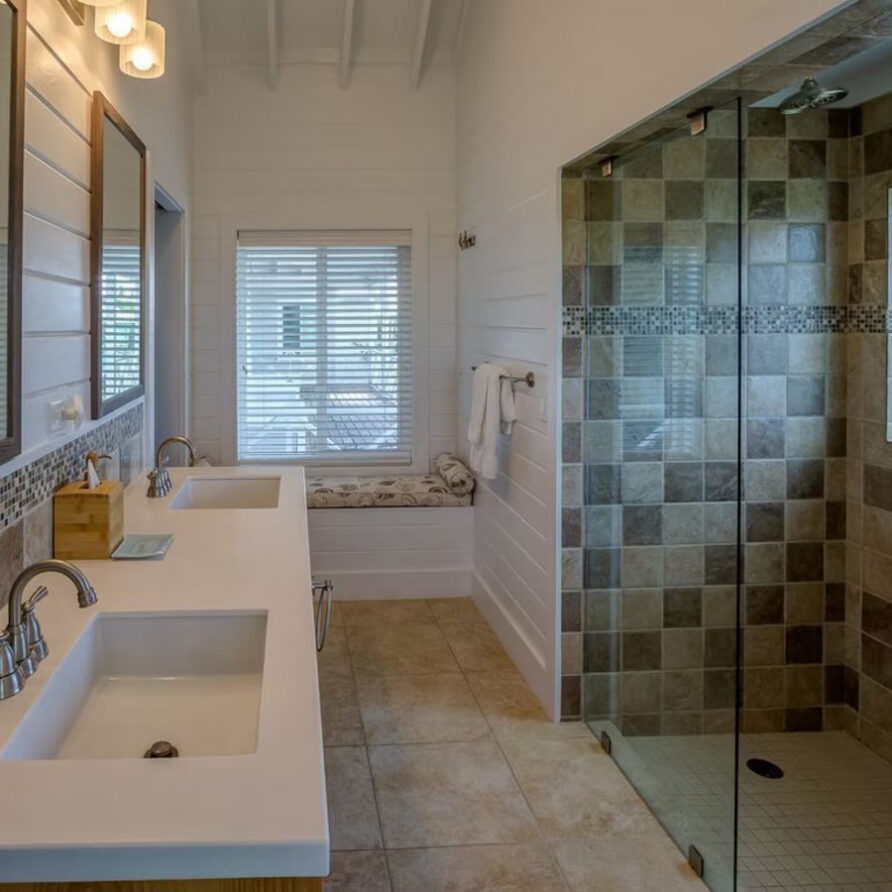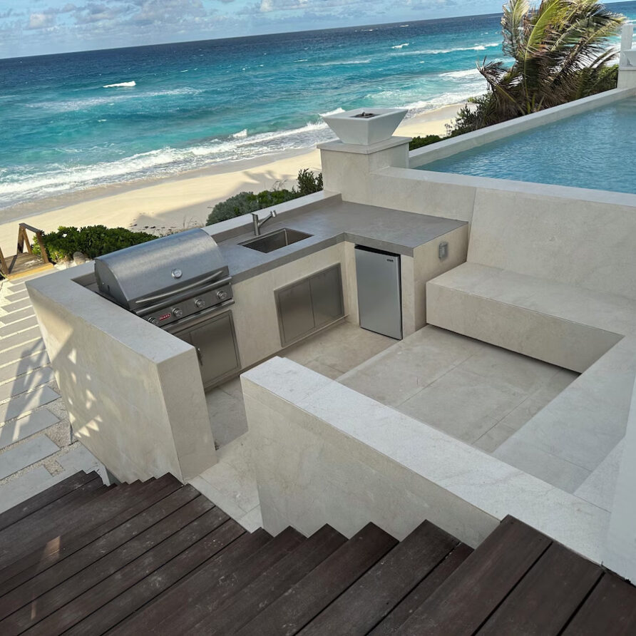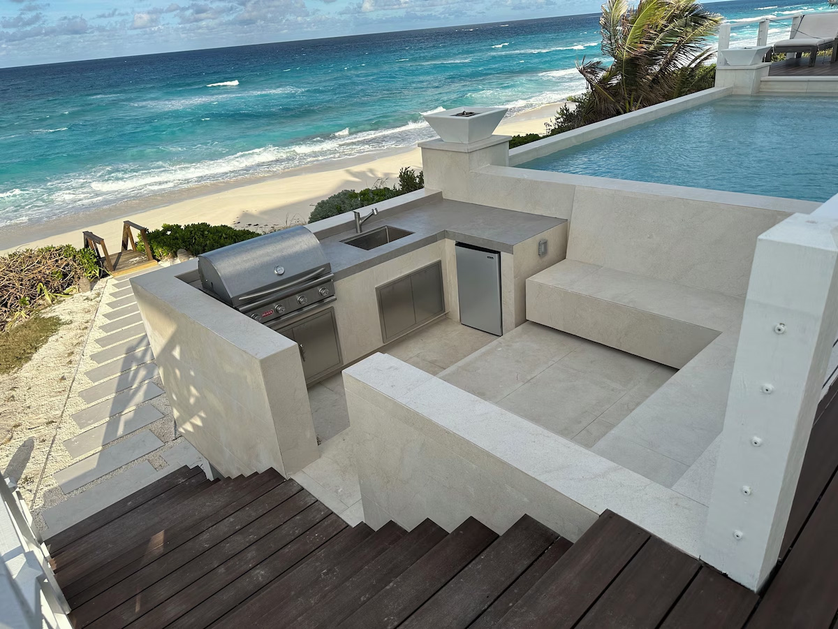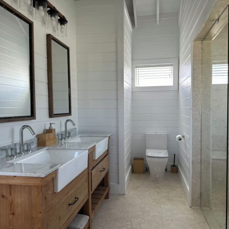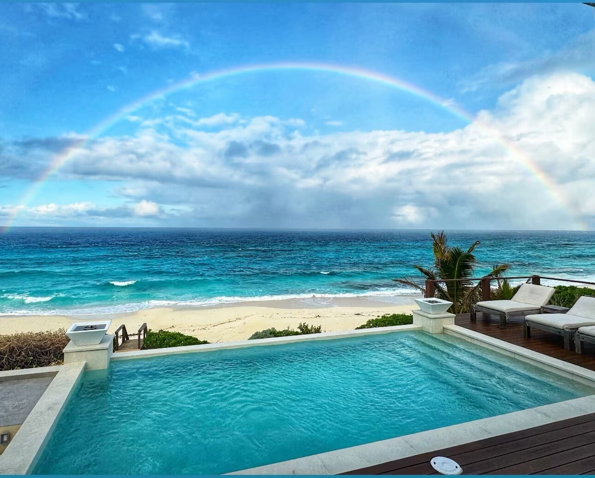 In the main cottage you will find the spacious living area with a very well equipped gourmet kitchen and large dining area where you can entertain 8 people comfortably. There is a powder room in the main cottage as well. On the sides of the main cottage you’ll find 4 cottages comprising 5 en-suite bedrooms each with private entrances and ocean views. The level of privacy is perfect for up to 5 couples or 2 families with children. Four of the 5 bedrooms are equipped with a desk, TV, lots of closet space with a safe (2 with safe), a private porch overlooking the ocean and Starlink internet. The 5th bedroom is a versatile space with stunning oceanfront views that can be configured as a private fitness studio—featuring a Pilates reformer, dumbbells, bands, and yoga mats or configured as bedroom with a queen Murphy bed. Guests must select their preferred setup prior to arrival.
