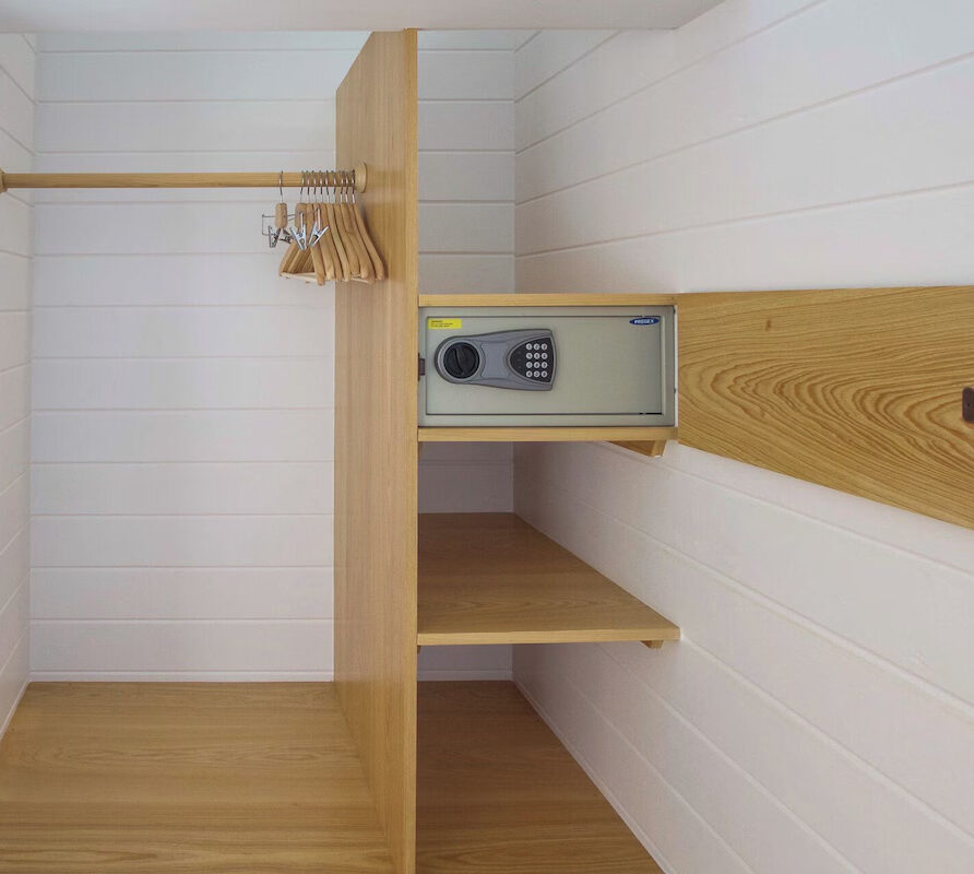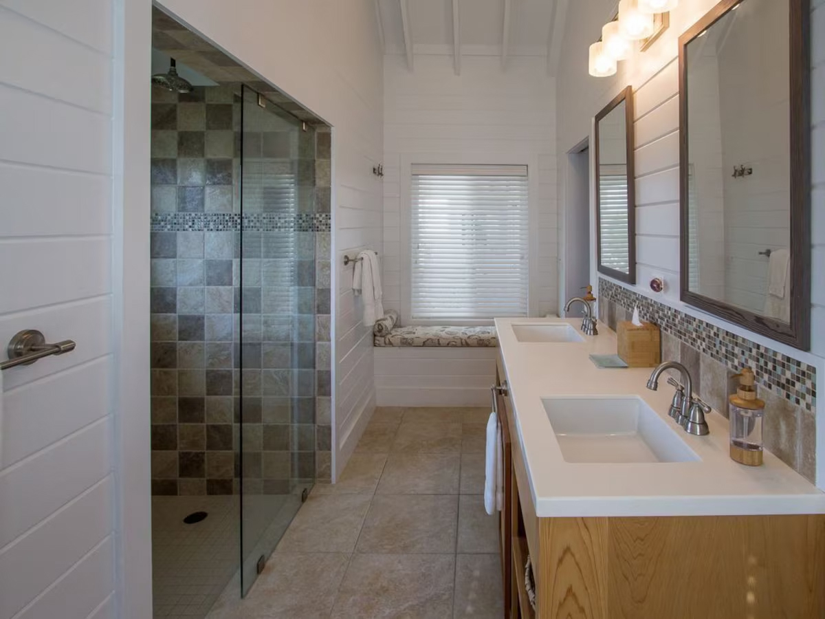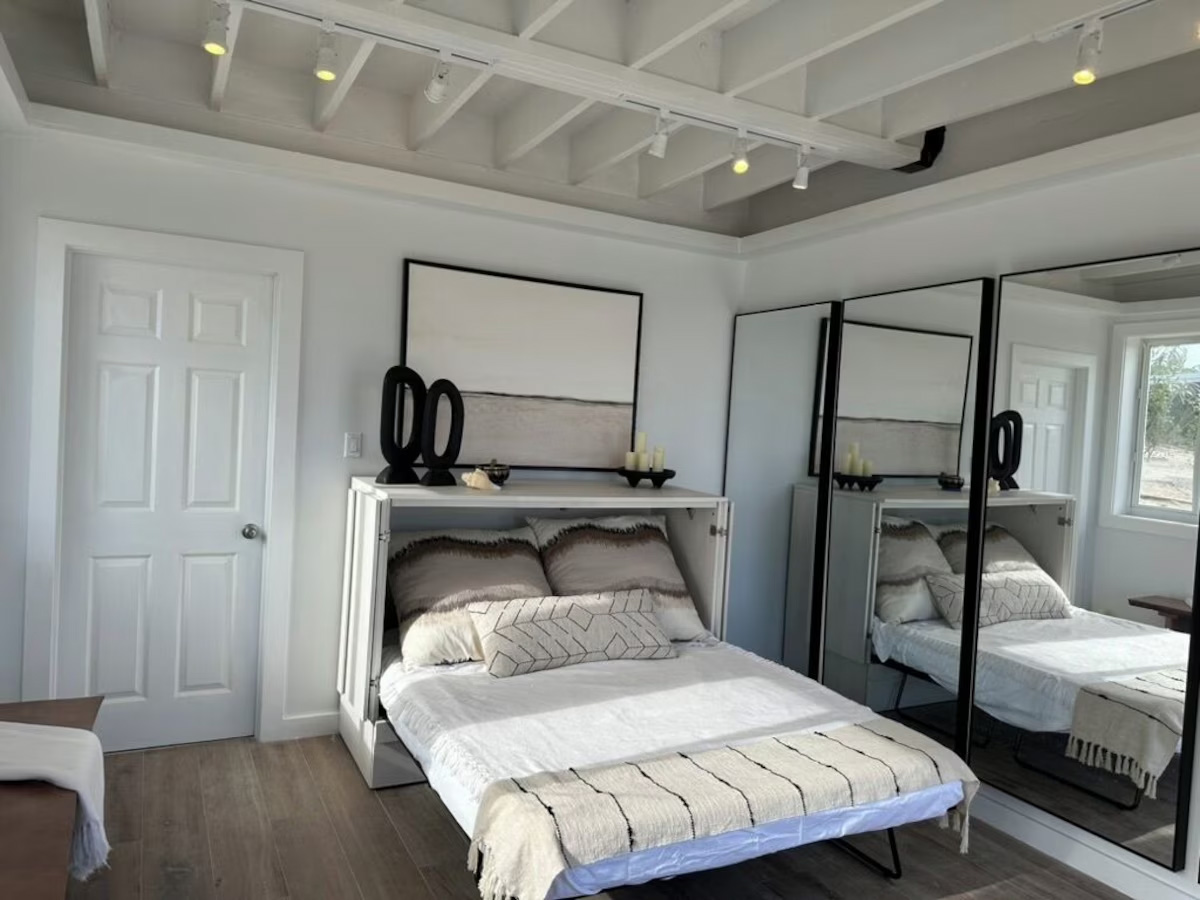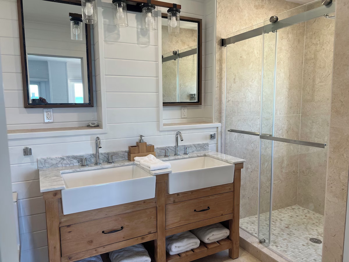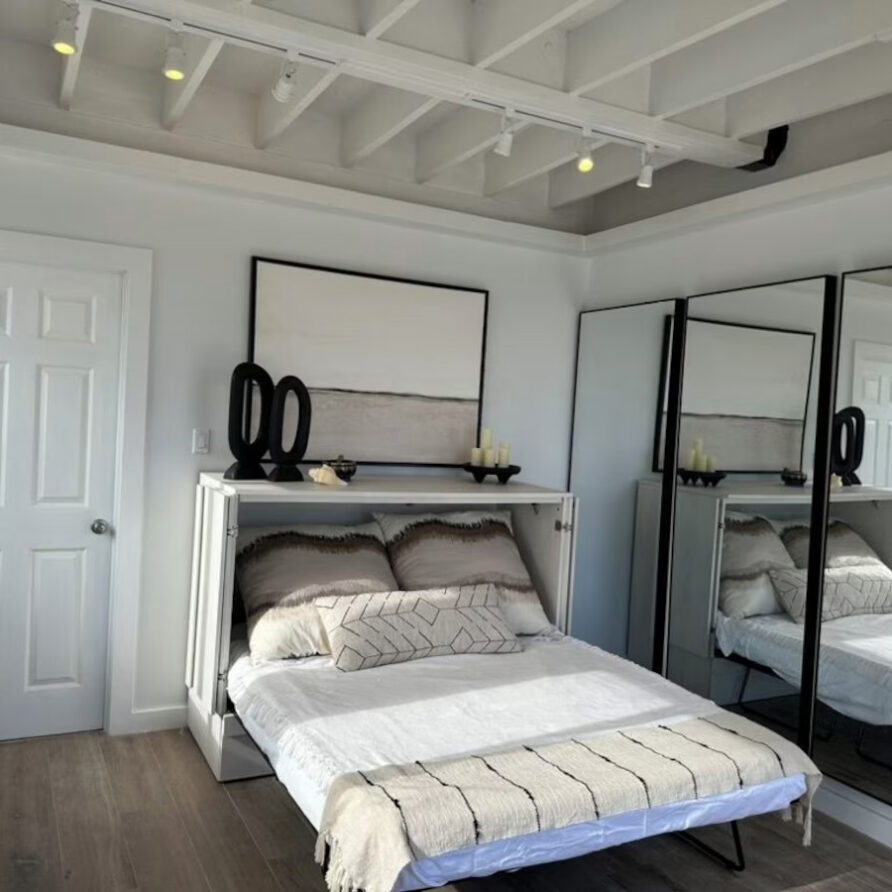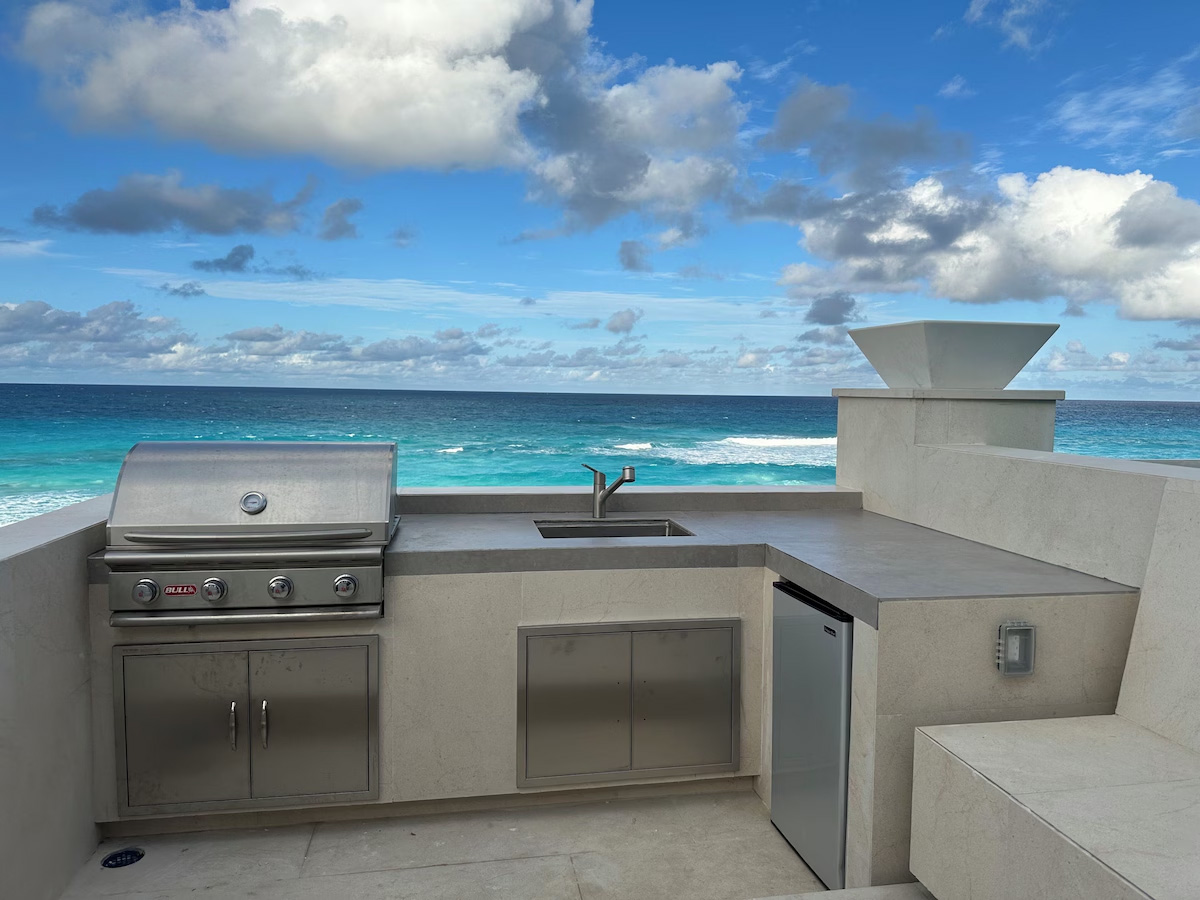 In the main cottage you will find the spacious living area with a very well equipped gourmet kitchen and large dining area where you can entertain 8 people comfortably. There is a powder room in the main cottage as well. On the sides of the main cottage you’ll find 4 cottages comprising 5 en-suite bedrooms each with private entrances and ocean views. The level of privacy is perfect for up to 5 couples or 2 families with children. Four of the 5 bedrooms are equipped with a desk, TV, lots of closet space with a safe (2 with safe), a private porch overlooking the ocean and Starlink internet. The 5th bedroom is a versatile space with stunning oceanfront views that can be configured as a private fitness studio—featuring a Pilates reformer, dumbbells, bands, and yoga mats or configured as bedroom with a queen Murphy bed. Guests must select their preferred setup prior to arrival.