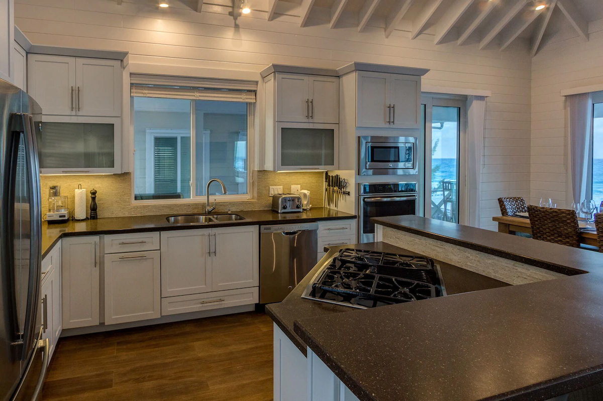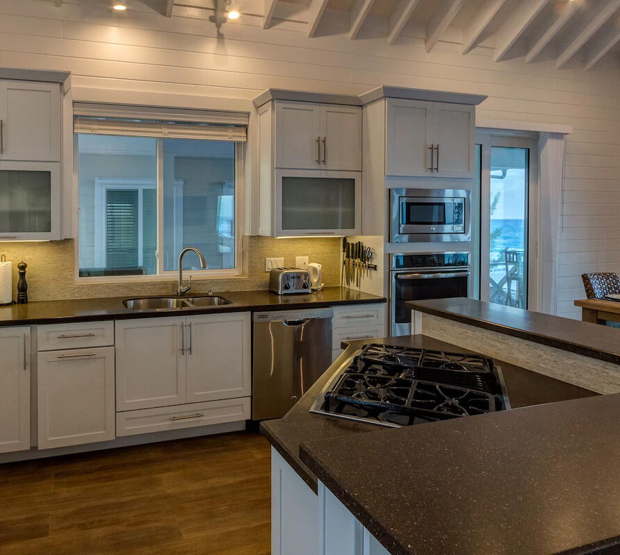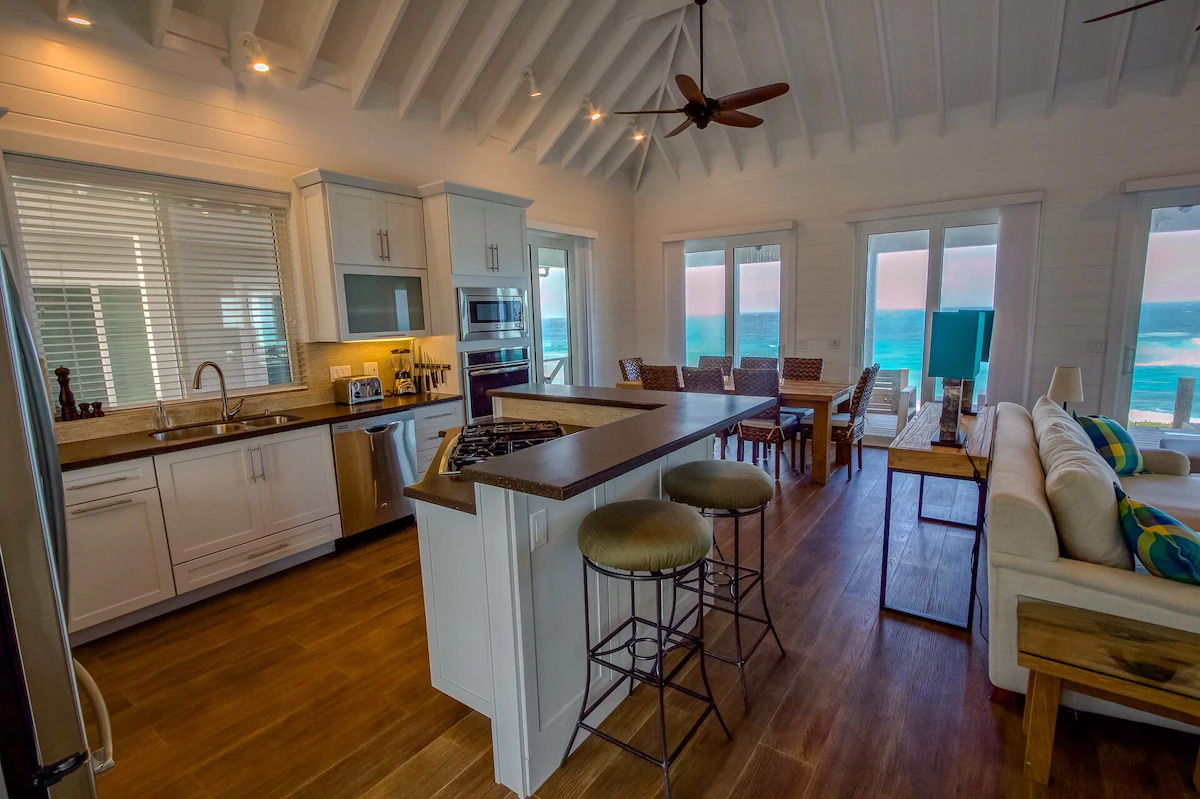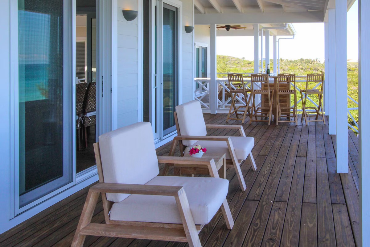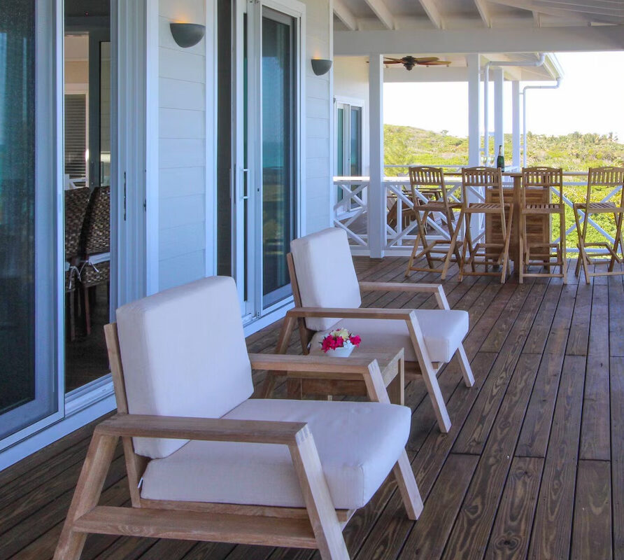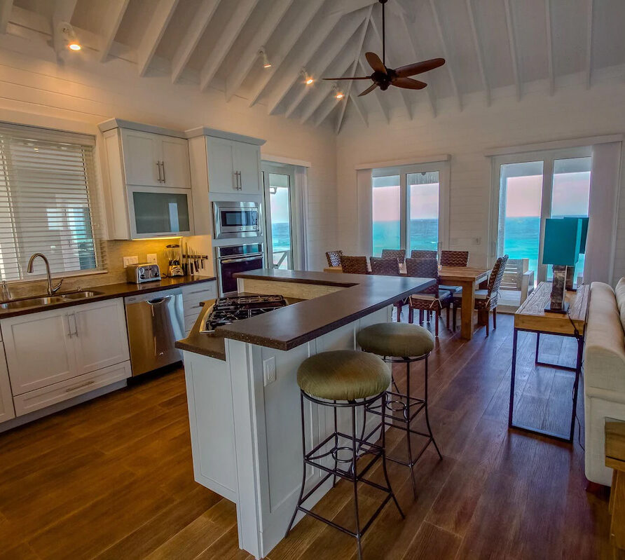 Wake up in the mornings and feel the breeze from the ocean through the open doors. Have a coffee on the private porch overlooking the Atlantic Ocean, while you go online and check the latest news and emails. The large deck on the Ocean side of the house comes with 4 lounge chairs, a bar area with stools, a first class propane barbecue, and an outdoor dining table. The living room opens up with sliding doors all around, with 3 doors facing the ocean and the large deck area. You’ll probably be living as much outside as inside. Air conditioning units keep the house nice and cool while you are basking on the beach and in the sun. Large outdoor fans will cool you off while you are outside on the porch, when there is no wind.